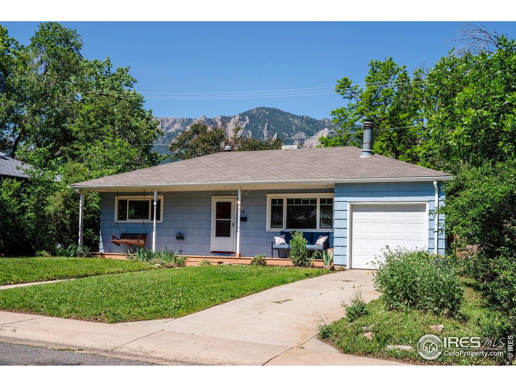 Enjoy Flatirons views from this Shabby Chic, sun-filled Martin Acres ranch with vintage charm and modern updates throughout. This 2-bedroom, 1-bath home features an open floor plan, hardwood floors, a cozy living room fireplace, and stylish retro touches including a Vintage Magic Chef stove/oven and a Unique Classic refrigerator. The beautifully updated kitchen offers butcher block counters, Zia tile backsplash, and a large stainless basin sink. Bonus spaces include an office with wood floors, a lofted sleeping area above the office, and a separate den with built-ins-perfect for work or guests. Step outside to a fully fenced backyard oasis with mature landscaping, garden boxes, a treehouse/playset, and a large deck with built-in benches, ideal for entertaining. The front porch with a hanging swing (it is excluded b/c it has personal importance), covered bike parking, and side entrance adds curb appeal and functionality. Recent upgrades include newer windows, light fixtures, ceiling fans, and an updated bathroom with subway tile, new vanity, and toilet. Evaporative cooler, irrigation system, front-loading washer/dryer, and ample storage in the garage/workshop space complete the package. Just blocks from trails, schools, and Chautauqua, and recently rented as for up to $4,000/m mid-term Airbnb.