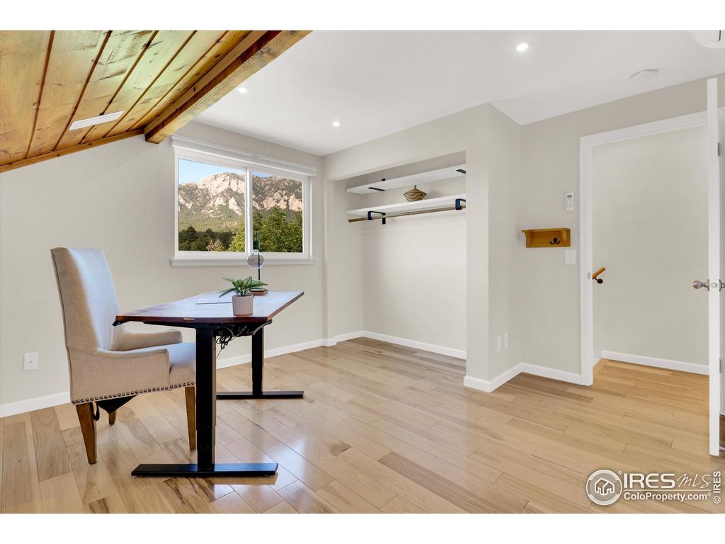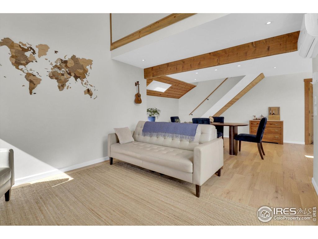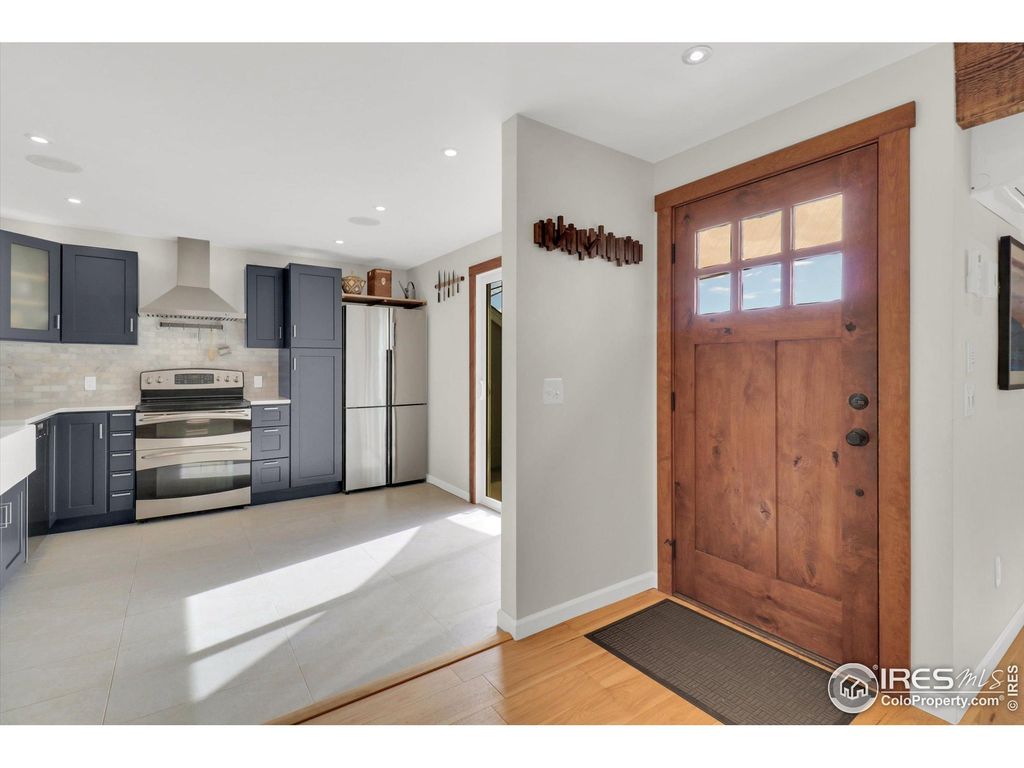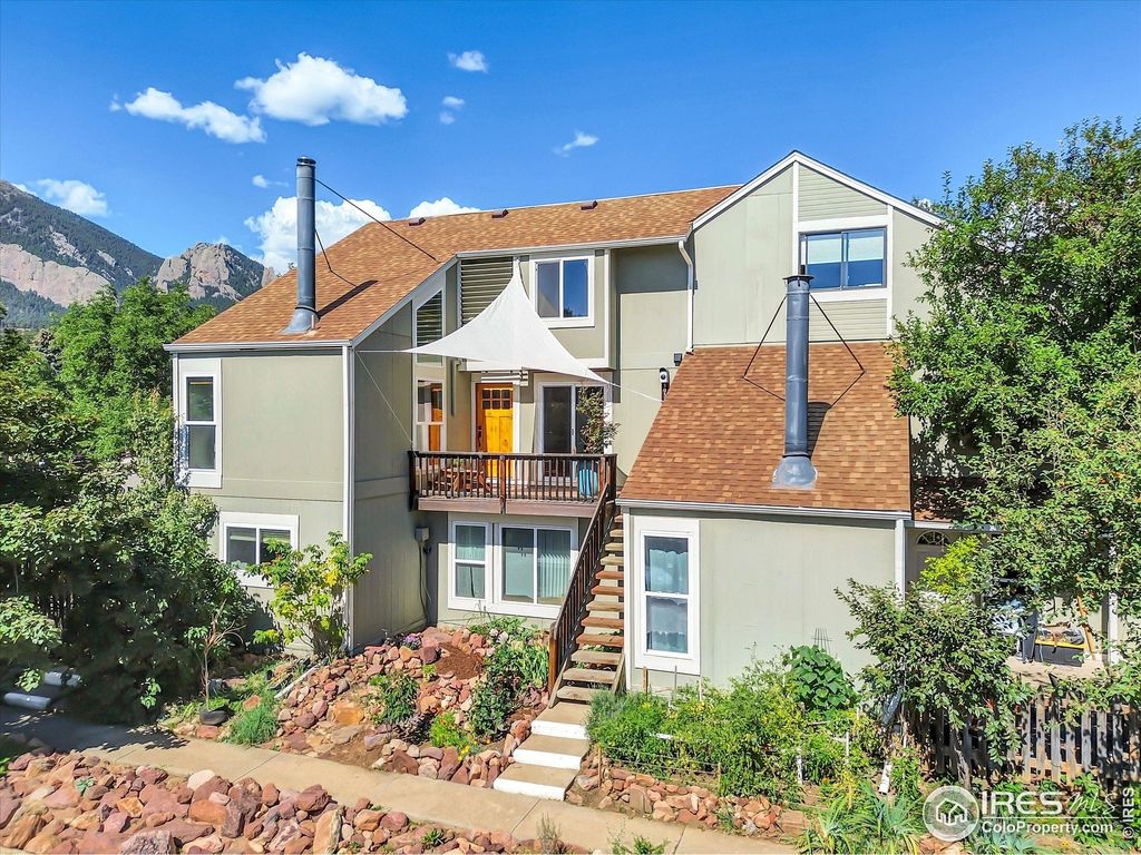 Step into your new home where every detail has been thoughtfully reimagined, wrapping you in a mountain-modern lifestyle, just steps from the endless mountain trails of south Boulder. In this end unit, turn-key home, with over $150,000 in updates, you will find new delights around every corner. The open, airy main level is perfect for entertaining friends and family or a cozy night at home. The fully remodeled kitchen (2025) sets a luxurious tone featuring Cambria Smithfield quartz counters and a Fireclay farmhouse sink atop shaker-style cabinetry in gun metal blue, all set against a Turkish marble backsplash. Cook with confidence thanks to your dishwasher by Miele, vented range hood, and French-door refrigerator w/ dual freezer. Custom ambrosia maple shelves and new tile flooring complete the look with charming character. Move seamlessly to the dining area to enjoy your meal or lounge in the vaulted living room, warmly paneled in cedar and perfectly temperature controlled to keep you cozy on a winter night with ample radiant heat from the wood burning stove or cool as you like during a warm afternoon thanks to the endless air conditioning of the LG mini-split system. This home glows with natural light, richly refinished wood beams, smooth-finish walls, and finely detailed, durable hickory flooring throughout. Upgraded recessed lighting throughout, a 3-zone speaker system and programmable 3-zone heating+cooling elevate your everyday living. Both baths have been beautifully redone. The upstairs full bath features travertine tile, programmable radiant heated floors, a frameless glass shower door, and a Native Trails Americana vanity. The main level half-bath adds style with a custom vanity of ambrosia maple and barnwood siding. The primary bedroom features custom Japanese-style vertical grain hemlock finishes. The secondary bedroom offers a stunning up-close view of Boulder's mountain parks - a priceless daily backdrop. Plus a detached garage for parking and storage.