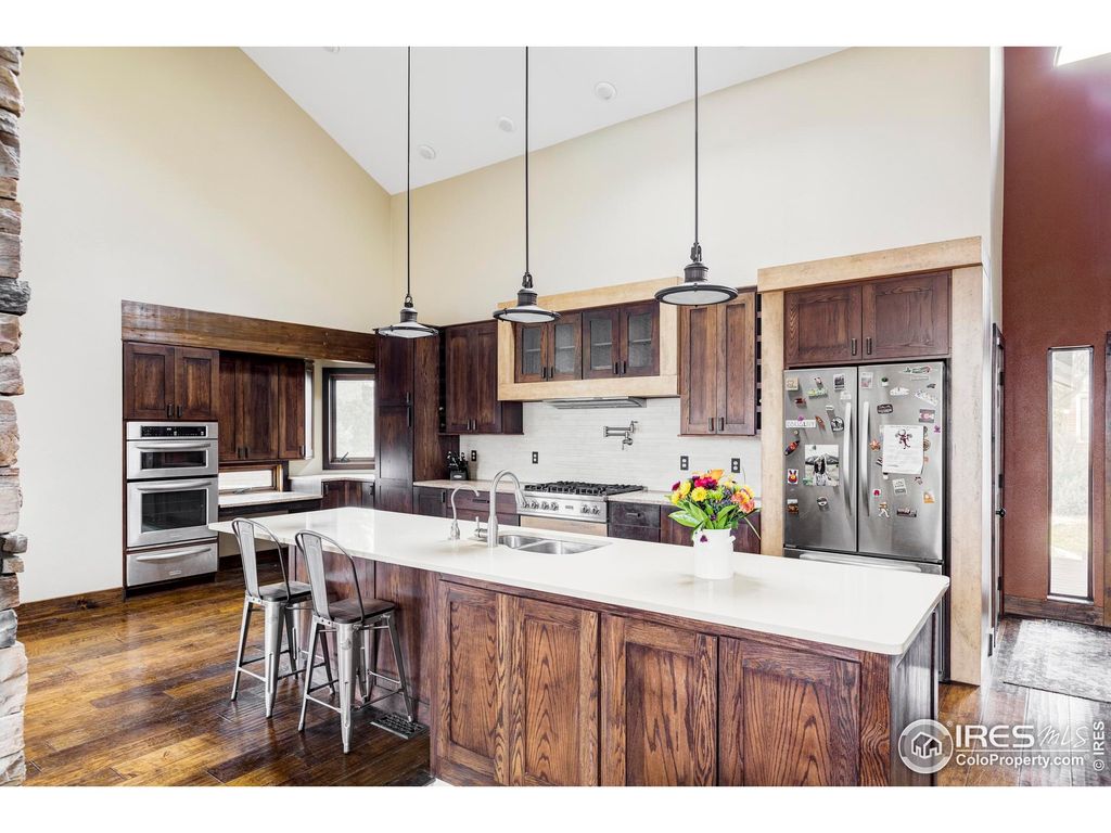 Nestled at the end of a quiet cul-de-sac in North Boulder, this stylish home offers a thoughtful layout, modern updates & inviting spaces for both relaxation & entertaining. Step inside to discover a bright & airy main level with an open floor plan, where tall ceilings & expansive windows enhance the sense of openness & hardwood floors add warmth throughout. A striking stacked-stone fireplace with a wood-burning stove anchors the great room, while natural light pours in from every angle. The beautifully appointed chef's kitchen showcases rich wood cabinetry, an oversized island, gas cooktop, convection oven, warming drawer, and pot filler, making it a dream for cooking & entertaining. The formal dining area, complete with elegant built-in shelving, opens onto an oversized back deck. A stylish sliding barn door separates the main living space from the private quarters, where the main-floor primary suite, 2 additional bedrooms & a well-appointed bathroom await. The serene primary retreat boasts soaring ceilings, direct access to the back deck, a walk-in closet & a recently updated en suite bathroom. Downstairs, the walk-out lower level provides exceptional flexibility, with ample space for guests, multigenerational living, or even future ADU potential. A spacious rec room opens onto a covered patio & fenced backyard, creating additional space to relax or entertain. Two additional bedrooms on this level offer versatility, including one with radiant floor heating, ideal for a home office. The lower level also features a full bathroom, a large laundry and storage room, a pantry & wine cellar. Outside, the oversized back deck & covered patio provide multiple options for enjoying the seasons. The attached garage includes extra storage and a workbench. Situated about a mile north of the Diagonal Plaza shopping area & a mile east of Lucky's Market and Wonderland Lake Park, this home offers both privacy and easy access to shopping, dining, and outdoor recreation.