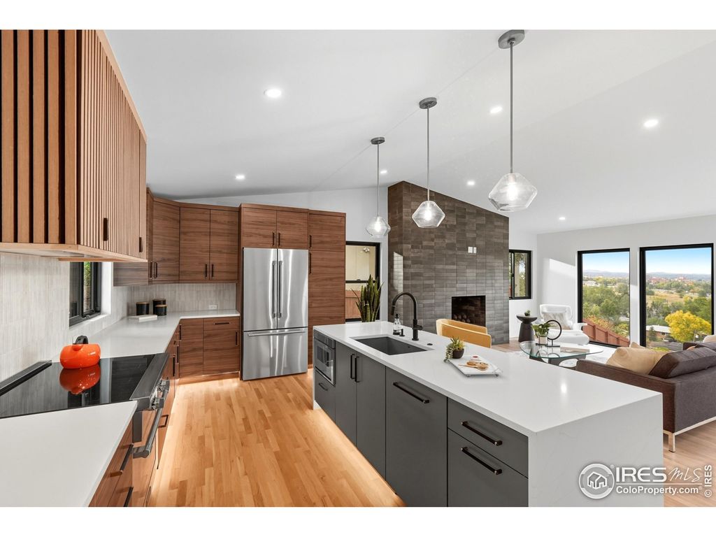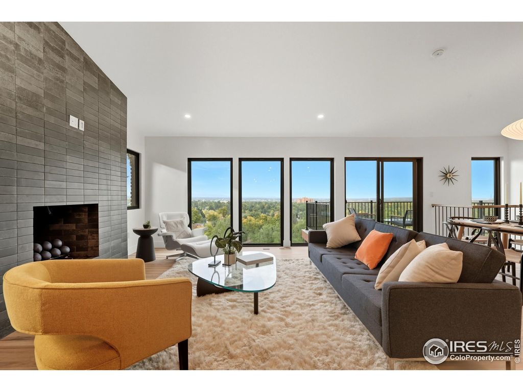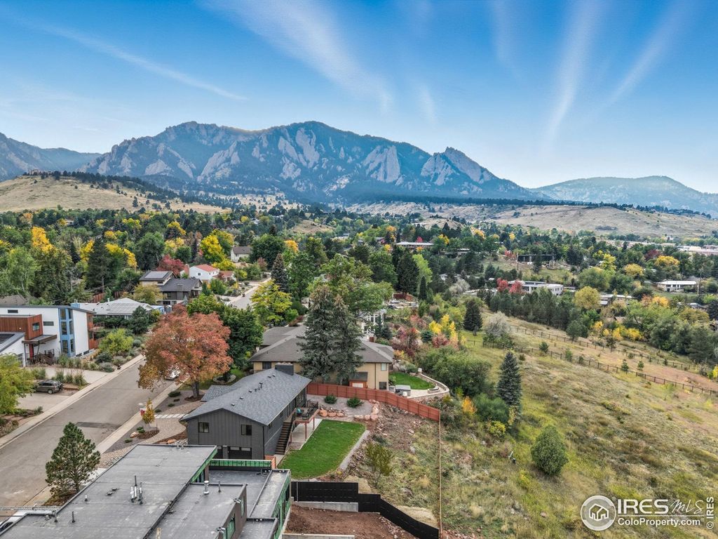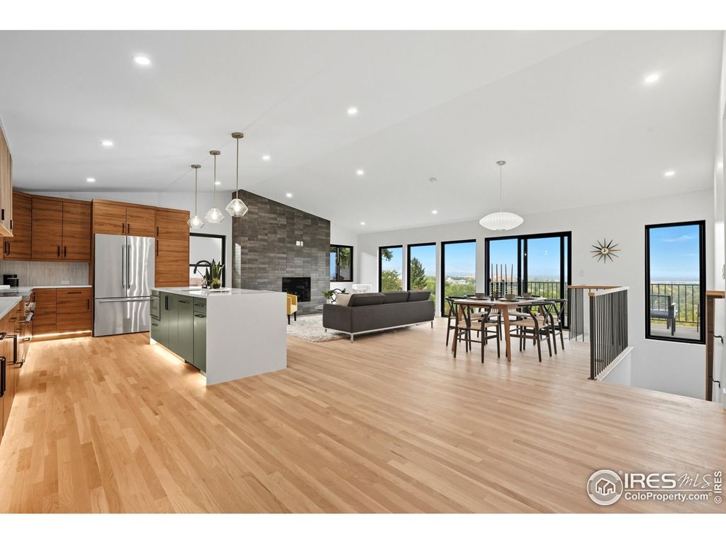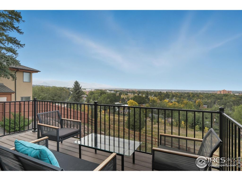 Fully remodeled home offering a stunning mid-century-modern design that's perched on .81-acre with panoramic views. This 4-bed, 3-bath ranch with walkout basement offers breathtaking views of Boulder & surrounding foothills. The inviting covered front porch leads into an open-concept layout with vaulted ceilings, oak wood floors, & a show-stopping fireplace that serves as the centerpiece of the space. The main level features a gourmet kitchen with Thermador appliances including a 36" induction oven, quartz countertops, custom wrapped vent-hood with hidden storage & 8.5ft custom island. The main living & dining area features floor-to-ceiling windows that showcase stunning city and mountain views, opening onto a scenic balcony, perfect for outdoor dining while providing access down to the backyard. The luxurious primary suite offers mountain views & includes a custom-designed bath with heated floors, fluted vanity, lighted medicine cabinets, & a spacious shower with dual shower heads. Two additional bedrooms, full bath with double vanity & mirrored medicine cabinets, along with multiple storage closets, complete the main level. The walk-out lower level has a rec-room with wood-burning fireplace & dry bar with beverage center. The lower level also includes a bedroom with an attached bath, laundry room with sink & storage, mudroom off the garage, & multiple storage closets. Sliding doors from the rec-room open to a covered patio that overlooks the fully landscaped backyard. Backyard is fully fenced & has been reimagined into an outdoor oasis for year-round enjoyment with large grass area, raised garden beds & stone steps that lead you into the naturally landscaped hillside. The exterior blends hemlock siding & brick with low-maintenance front yard xeriscaping, drip irrigation, & oversized 2 car garage with space for workshop. Moments from multiple trails & zoned for some of Boulder's most sought-after schools. Panoramic views & large lot make this a rare Boulder retreat