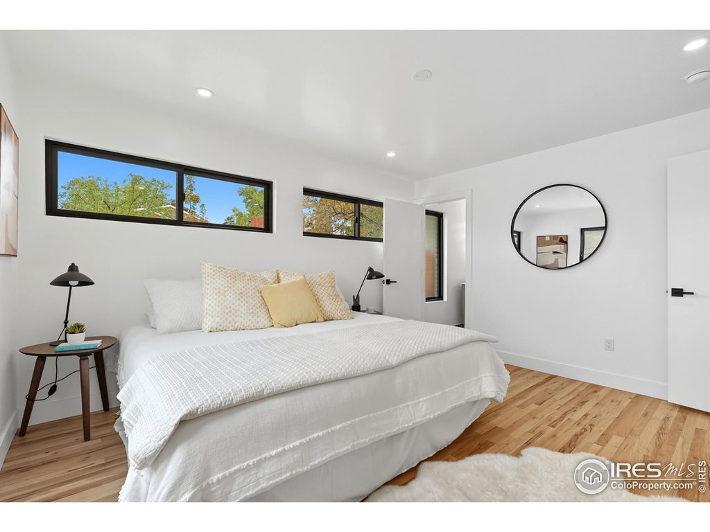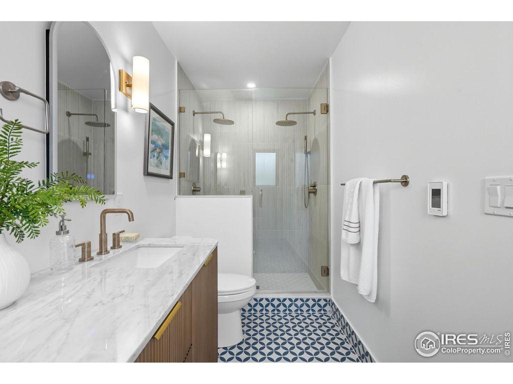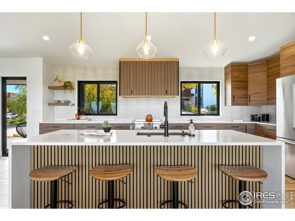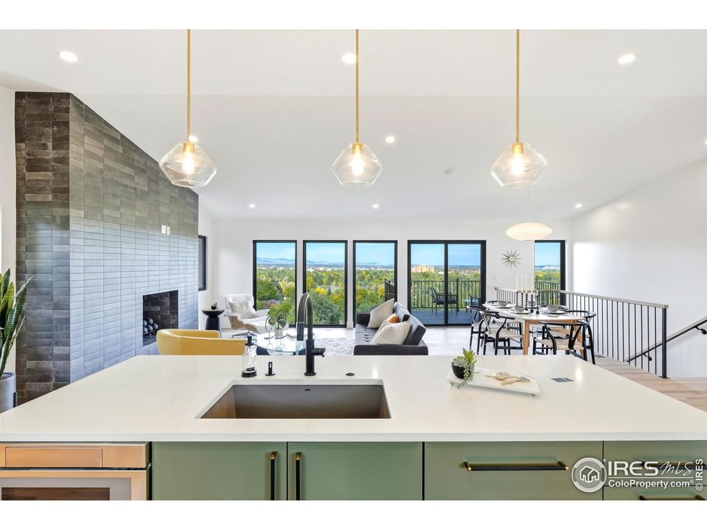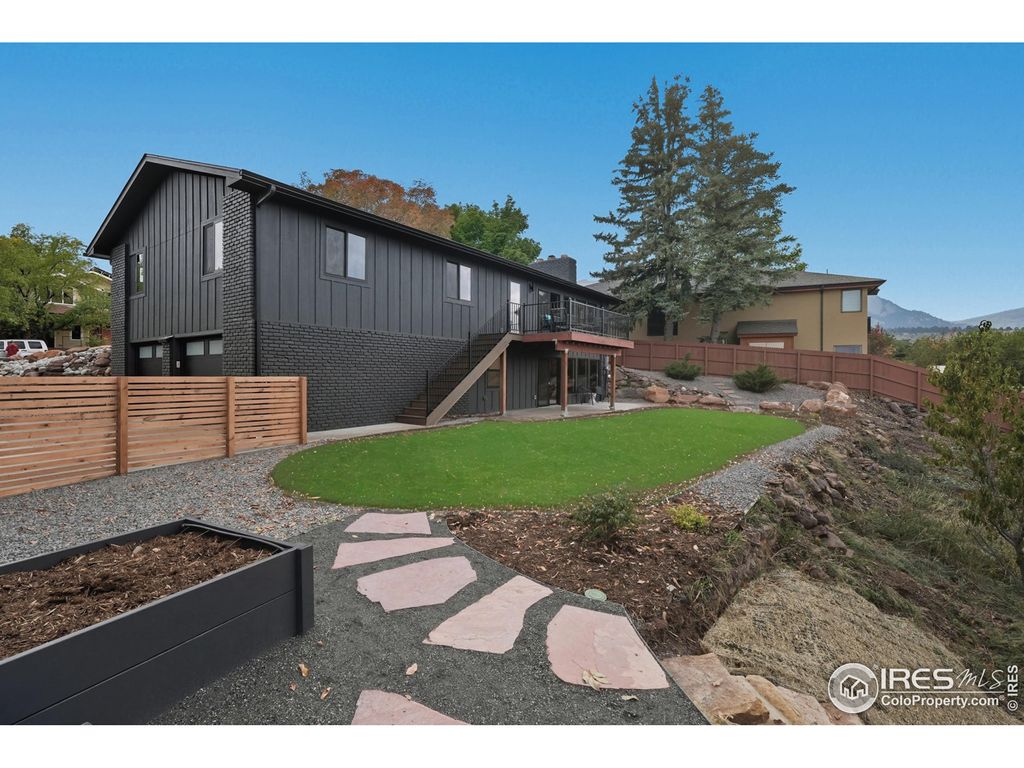 Fully remodeled home offering a stunning mid-century-modern design that's perched on .81-acre with panoramic views. This 4-bed, 3-bath ranch with walkout basement offers breathtaking views of Boulder & surrounding foothills. The inviting covered front porch leads into an open-concept layout with vaulted ceilings, oak wood floors, & a show-stopping fireplace that serves as the centerpiece of the space. The main level features a gourmet kitchen with Thermador appliances including a 36" induction oven, quartz countertops, custom wrapped vent-hood with hidden storage & 8.5ft custom island. The main living & dining area features floor-to-ceiling windows that showcase stunning city and mountain views, opening onto a scenic balcony, perfect for outdoor dining while providing access down to the backyard. The luxurious primary suite offers mountain views & includes a custom-designed bath with heated floors, fluted vanity, lighted medicine cabinets, & a spacious shower with dual shower heads. Two additional bedrooms, full bath with double vanity & mirrored medicine cabinets, along with multiple storage closets, complete the main level. The walk-out lower level has a rec-room with wood-burning fireplace & dry bar with beverage center. The lower level also includes a bedroom with an attached bath, laundry room with sink & storage, mudroom off the garage, & multiple storage closets. Sliding doors from the rec-room open to a covered patio that overlooks the fully landscaped backyard. Backyard is fully fenced & has been reimagined into an outdoor oasis for year-round enjoyment with large grass area, raised garden beds & stone steps that lead you into the naturally landscaped hillside. The exterior blends hemlock siding & brick with low-maintenance front yard xeriscaping, drip irrigation, & oversized 2 car garage with space for workshop. Moments from multiple trails & zoned for some of Boulder's most sought-after schools. Panoramic views & large lot make this a rare Boulder retreat