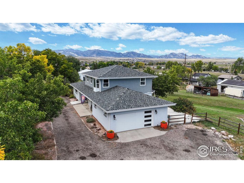 Tucked away in the highly desirable Alkire Estates community, this beautiful modern farmhouse design 4-bed/4-bath home is the perfect balance of rustic elegance, comfort and functionality. A 10-car detached garage/workshop will make this property your forever home. Step inside to an inviting open-concept main floor highlighted by rich hardwood flooring and expansive windows. Natural light, views of Standley Lake, the Flatirons & snow capped peaks give a true Colorado experience. The gourmet kitchen is a chef's dream with custom designed quartz countertops, JenAir suite of appliances including a dual-fuel oven/range and a wine cooler. The oversized island flows into the breakfast nook and adjoining family room. A separate dining room and a private den/office add both style and versatility. The primary suite includes a spa-like walk-in shower and oversized "His & Hers" closets. Two more bedrooms and one more bathroom complete the 2nd level. The finished basement expands the living space with a large rec room, a 3/4 bathroom and guest accommodations. Outdoors, a covered patio and Trex deck offers the perfect setting for year-round entertaining on a 1-acre lot. The heated workshop is a car lover's dream shop. Built on a foundation slab it is equipped with 220v electrical and has 12' & 8' doors. Plenty of space for all of your projects and collections. Standley Lake Regional Park and Wildlife Refuge is just minutes away where you can enjoy hiking, biking, paddleboarding and scenic trails. This location unbeatable and the lifestyle is exceptional. Schedule your showing today.