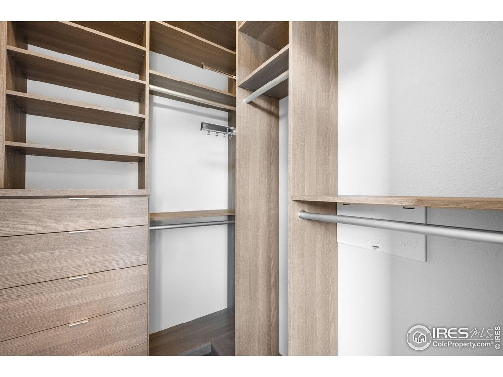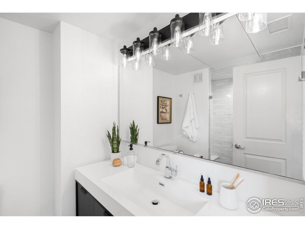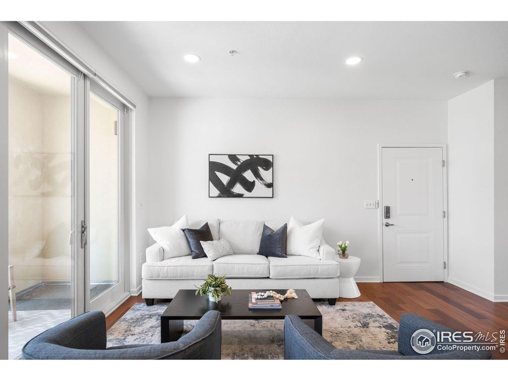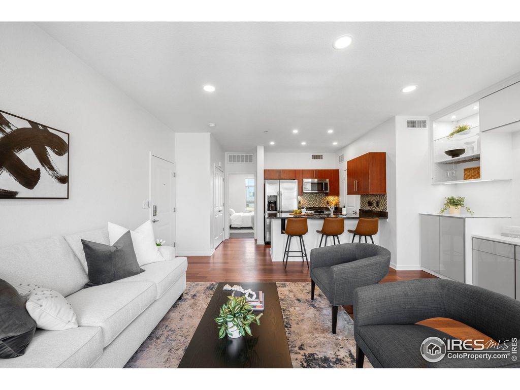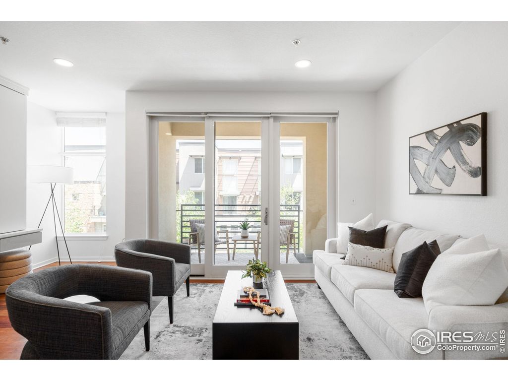 Revel in refined urban living in this mid-floor residence in the coveted Village at Uptown. Featuring Euro-inspired designer finishes, this light-filled residence boasts soaring ceilings, floor-to-ceiling glass and rich wood flooring. A sleek kitchen showcases granite countertops, stainless steel appliances, a tiled backsplash and beautiful wood cabinetry. The spacious one-bedroom layout includes a rare, separate workspace with its own bath - ideal for remote work or creative pursuits. Enjoy morning sunlight and fresh air on the oversized private balcony. The sizable bedroom is complemented by a serene bath with a walk-in shower and modern fixtures. Custom built-in California Closets enhance storage and functionality throughout, including curated closets, a pantry and an entertainment center. A detached garage adds convenience. Residents enjoy a central location with proximity to shopping and eateries in North Boulder, the NoBo Library and nature trails, plus easy access to Downtown Boulder amenities.