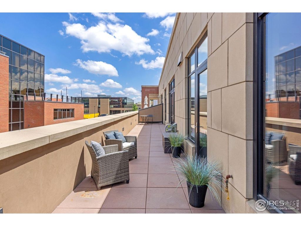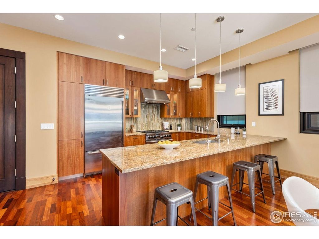 Premiere Location and a Rare-3 bedrooms/3 baths/3 secure parking spaces; an exceptional building and property in Boulder's vibrant downtown. Once inside, the heart of the home is an expansive open living/dining/kitchen concept, with Brazilian cherry hardwood floors and a wall of windows. A modern gas fireplace serves as the focal point, creating an atmosphere perfect for gathering. The chef's kitchen, a space where culinary inspiration comes alive, equipped with top-of-the-line stainless steel appliances, granite countertops, a spacious center island with breakfast bar seating, and custom cherry cabinetry. The outdoor space is the entire length of the property with access from the living room and 2 of the bedrooms. This patio is on the alley, the quiet side; here you can container garden with your tomatoes and flowers, fire up your gas grill and soak up the afternoon sunshine. The residences have great pride in their ownership and it shows by newly updated common interiors, which are lively and fresh.