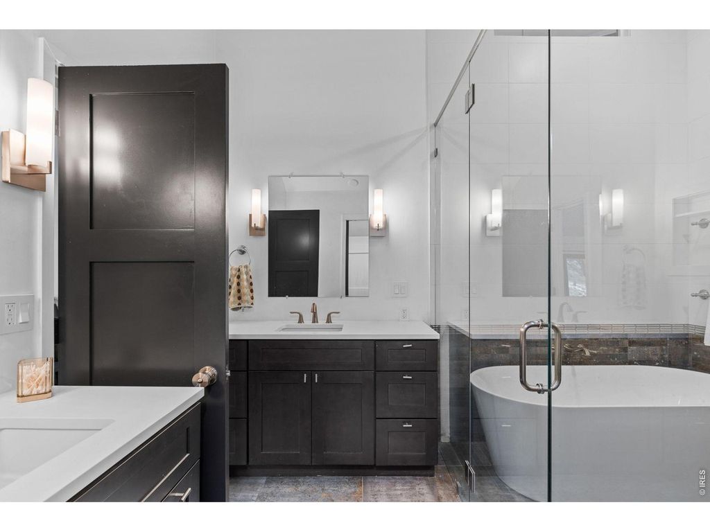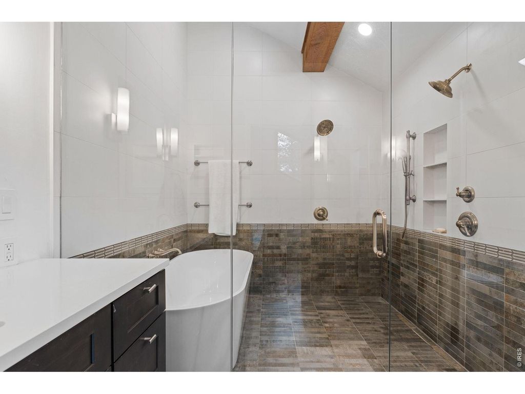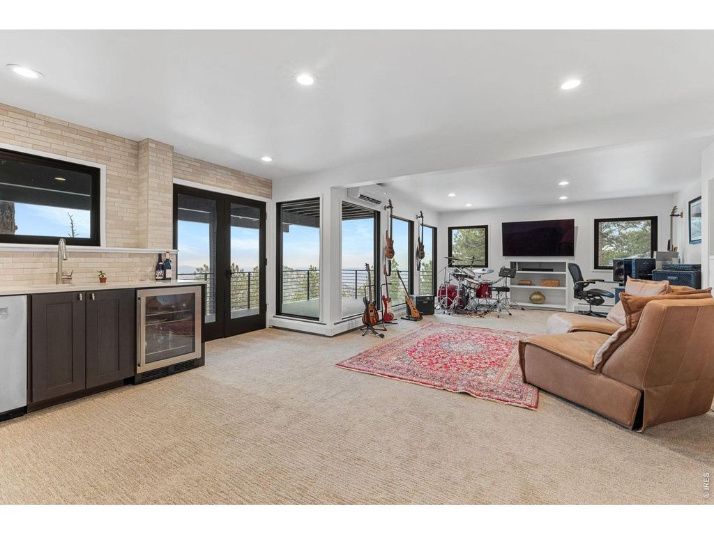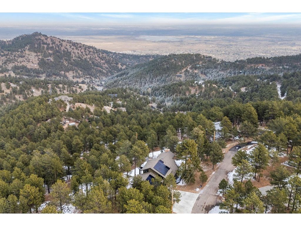 Perched atop Pine Brook Hills yet only 3 miles/15 minutes to Pearl Street, 93 Hawk Lane offers an unparalleled sanctuary, presenting breathtaking panoramic views that stretch from the majestic Flatirons to the sparkling cityscape, all while maintaining a convenient proximity to Pearl Street's vibrant pulse. The 14-foot vaulted great room serves as the home's stunning centerpiece, where walls of glass bathe the space in natural light, accentuating the rich textures of exposed oak beams and the sleek, modern design of the gourmet chef's kitchen. Equipped with top-of-the-line Thermador appliances, a generous island, and abundant counter space, this culinary haven is perfect for both elaborate creations and casual gatherings. The expansive deck extends the living space outdoors, providing an ideal setting for al fresco dining under a canopy of stars, with the twinkling city lights as a backdrop. The primary suite is a private retreat designed for ultimate relaxation, boasting vaulted ceilings and a spa-like ensuite bath. Indulge in the luxurious finishes, including heated floors, custom tilework, a freestanding soaking tub, and a dual-head shower. Dual vanities with soft-close cabinets and quartz countertops complete this serene escape. Two additional bedrooms on the main level offer comfortable accommodations with built-in closet systems. The lower level provides versatile spaces and an entertainer's dream with a recreation area and a wet bar that opens onto a private deck, showcasing breathtaking city views. Recent upgrades to electrical, plumbing, and lighting, along with an electric car charger and tankless hot water heater, ensure modern comfort and efficiency, while a separate heated studio creates the perfect office space. This residence offers the quintessential Boulder lifestyle, seamlessly blending peaceful seclusion with easy access to world-class hiking trails and the vibrant cultural scene of downtown. Gigabit Ethernet or Starlink are both available.
