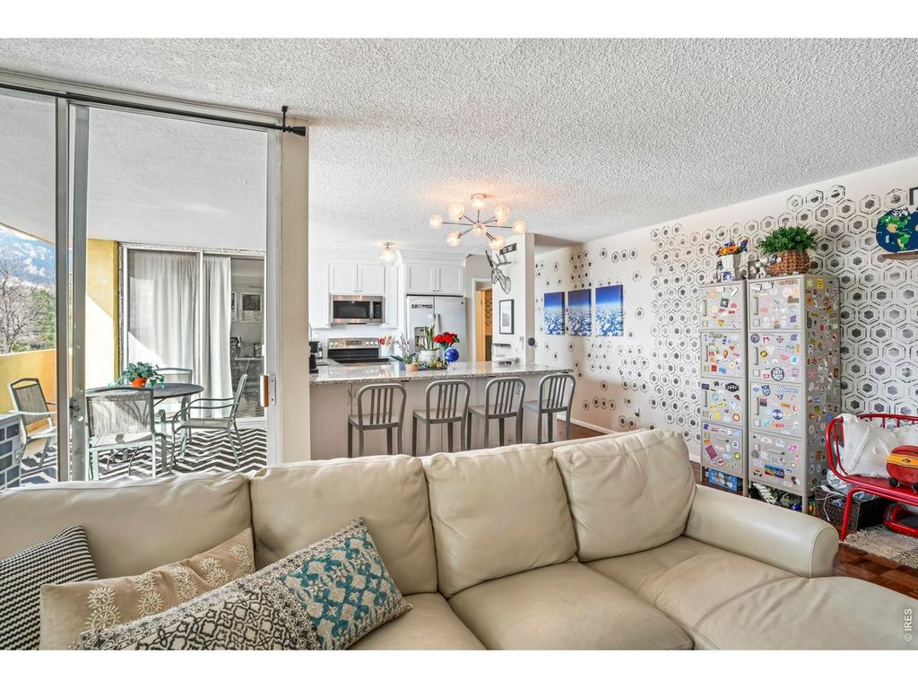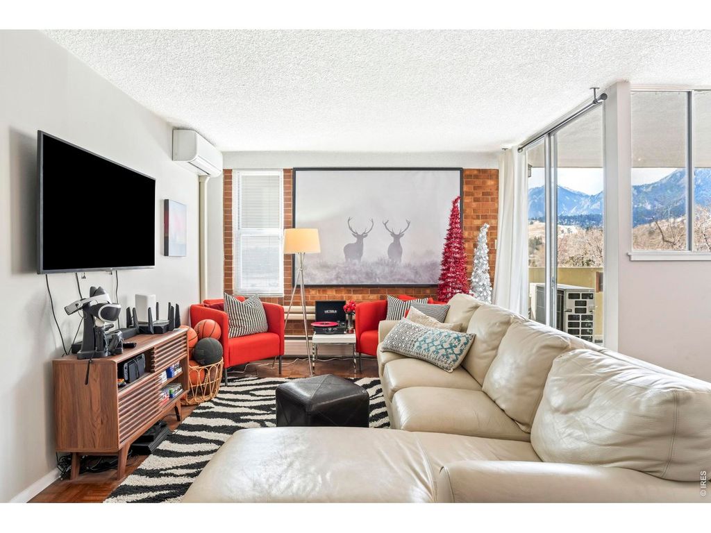Directly across from the University of Colorado Boulder campus, this updated residence in University Hill offers exceptional convenience and investment potential. Perfectly suited for students, professionals or investors, this condo is set within a secure building and showcases thoughtful upgrades throughout. An open-concept layout enhances both flow and functionality, achieved by removing the wall between the kitchen and living area to create a bright, connected space with southern mountain views. The kitchen features updated cabinetry, countertops, lighting and a peninsula with seating, while the living area extends to a covered balcony through sliding glass doors. Exposed brick accent walls in the bedrooms add character and warmth, and the primary suite provides direct balcony access. Additional upgrades include refreshed bathrooms with modern finishes and three new mini-split A/C units for year-round comfort. Residents also enjoy access to a rooftop deck with sweeping views.