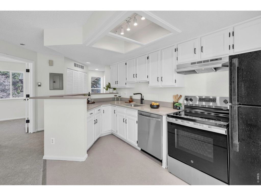 Charming 2-bedroom, 1-bath top floor, corner unit home on the park in highly desirable Gunbarrel location! This light-filled residence showcases stunning views to the park and greenspace through newer windows and features brand-new carpet and luxury vinyl tile. The open-concept floor plan is enhanced by vaulted ceilings, skylights, and a striking stone fireplace that anchors the living space. The beautifully updated kitchen includes new quartz countertops, an undermount stainless sink with modern faucet, freshly painted cabinets, and three new stainless steel appliances. Enjoy thoughtful upgrades including all-new interior paint, stylish lighting fixtures, updated hardware, and a refreshed bathroom with a new quartz counter, sink and mirror. Step outside to your private deck, accessible from the kitchen and backing to the serene community open space. One reserved carport spot. Community amenities include a swimming pool, hot tub, tennis courts, and a nearby park. Excellent Gunbarrel location near the natural beauty of Twin Lakes Trail or water activities at Boulder Reservoir, then kick back at Apertivo or Avery Brewing! Nearby shopping and dining plus ideally located with easy access to Boulder and Longmont.