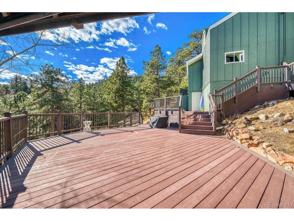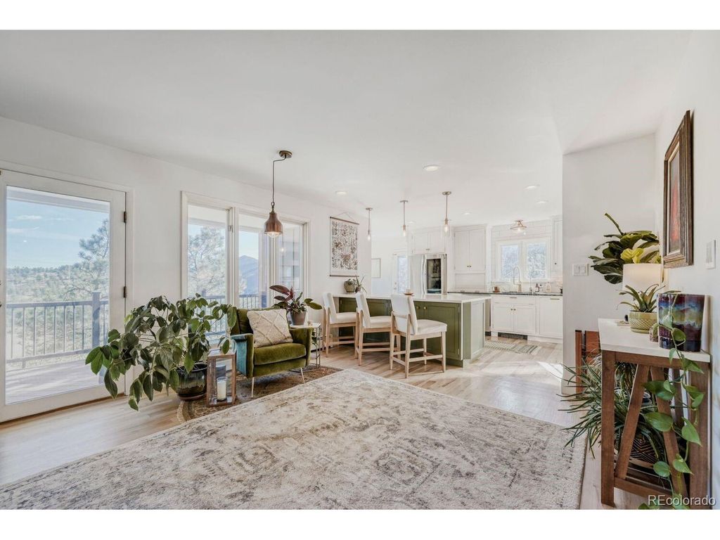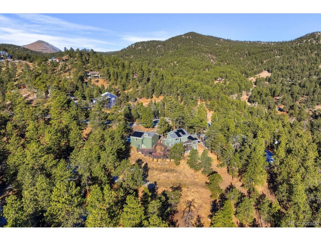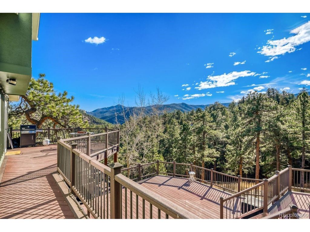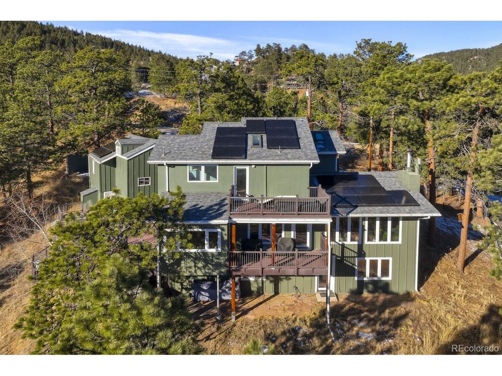 Spectacular home with breathtaking mountain views is a tranquil retreat just 10 minutes from Pearl Street. Natural light flows through this beautifully remodeled home w/newer hardwood floors, updated wood staircase, railings, custom newel posts, newly remodeled primary bathroom w/marble floors, dual shower heads, free standing soaking tub, double sinks w/new quartz counters & skylights. This home has a charming Scandinavian feel. A chef's dream w/ a remodeled gourmet kitchen complete w/ both quartz & granite counters, Viking range w/gas burners, Viking vent hood, microwave drawer, large farm sink, large cabinets w/ pull-out drawers for pantry items & a wonderful coffee bar w/ cabinets & mountain views. The cozy wood burning fireplace surrounded by stone invites you to sit down, relax & enjoy the views. Lots of outdoor spaces for gathering & enjoying the views including a 1,300 sq ft. deck w/ a built-in hot tub (New in 2023), both covered & uncovered deck areas to take in the views, a lovely balcony off the large primary bedroom w/ vaulted ceilings to enjoy sunsets, convenient covered deck off the family room & flagstone patio off the walk-out lower level. Mountain views from nearly every room in the house. 4 bedrooms plus an office w/ a cozy pellet stove & mountain views. Large steam shower seats at least 4 people. This home has been beautifully updated w/ remodeled main floor bathroom w/ beautiful tile. Lots of windows & skylights throughout bring the outdoors in. Solar panels are owned for low electricity bills. Back up generator. Large 3 car garage & a wonderful wine cellar. New light fixtures & outlets, new paint inside & out in 2024. This home is a gem! New roof & septic system in 2023. EV charger in garage is included. Outdoor movie screen & tree swing. Great location close to Betasso Preserve for cycling, hiking & horseback riding. A short drive to Boulder Creek for fly fishing & trails. 30 min drive to Eldora Ski Resort. Short walk to school bus stop.