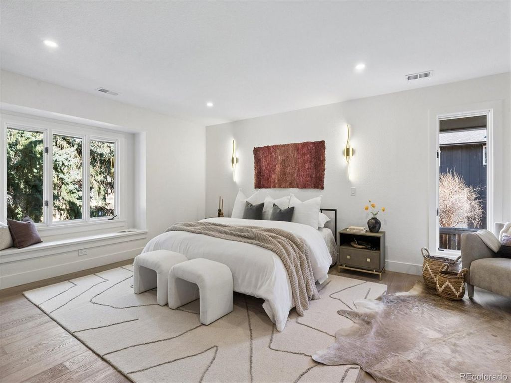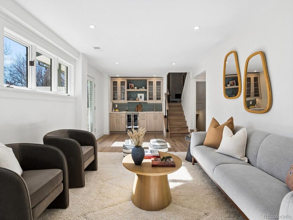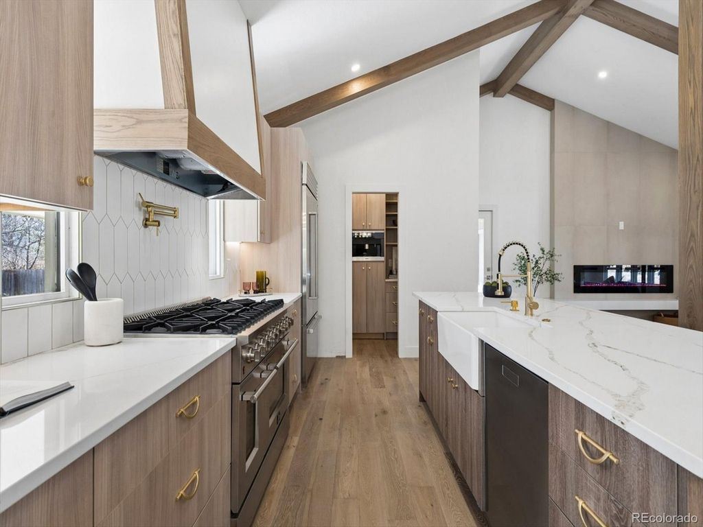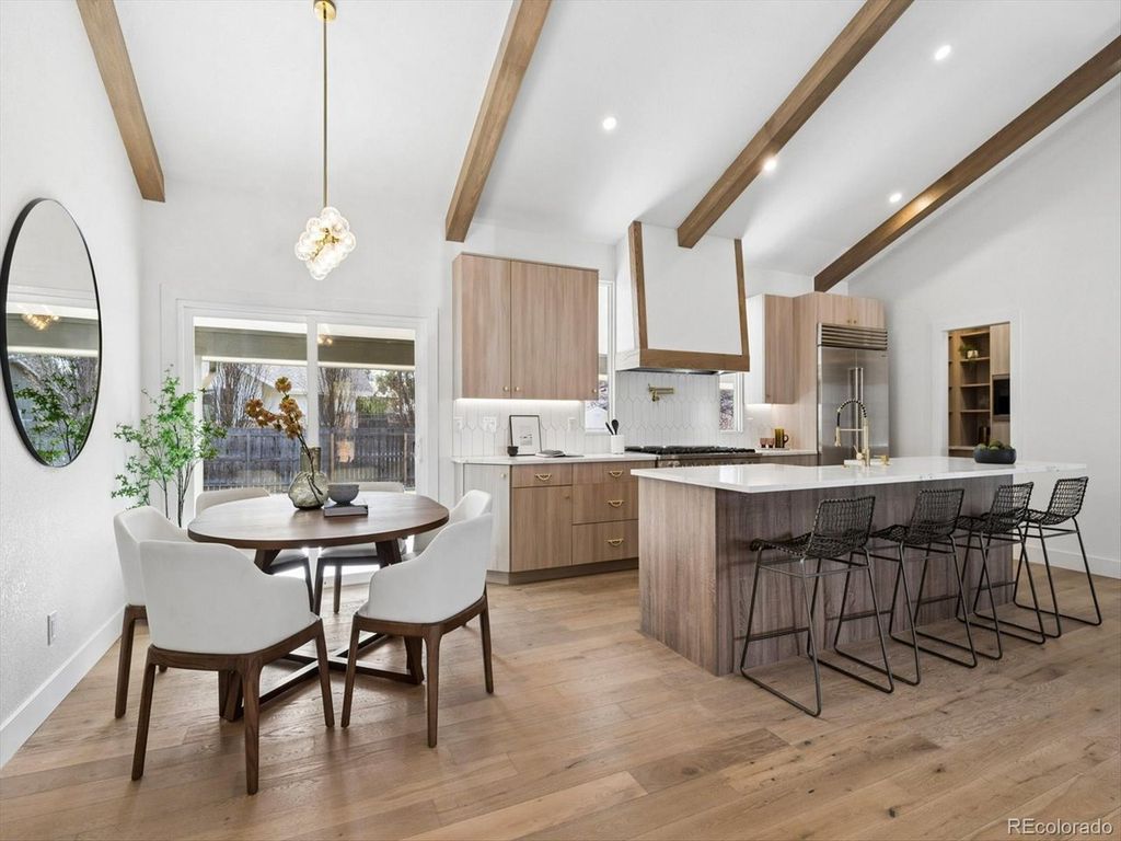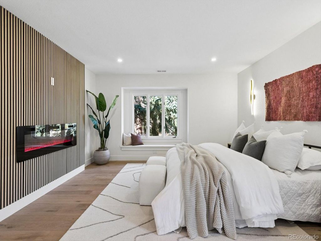 Set within the highly sought after Boulder Country club community, this fully renovated 4 bed, 4 Bath residence blends warm, refined elegance with a sophisticated contemporary aesthetic. From the moment you step inside, the open great room and Chef's kitchen make a striking impression with vaulted ceilings, custom wood beams, fireplace, and wide planked hardwoods throughout. Thoughtful design details elevates the space, including a charming window seat, and an expansive walk-in pantry, outfitted with an abundance of custom cabinetry, Quartz countertops, and a Miele Coffee Station! The heart of the home is the Chefs kitchen and adjacent eat-in dining area, designed for both everyday living and effortless entertaining. Anchored by the 48 inch double-oven gas range and a Sub Zero refrigerator, it features a custom built oversized hood, quartz countertops, and crafted cabinetry. An expansive islands seats 4-6, creating the perfect space for gathering family and guests. The primary suite is a true retreat anchored by a tranquil fireplace and charming window seat. A custom walk-in closet-thoughtfully designed with a stackable washer and dryer which adds an exceptional layer of convenience. The spa inspired bath is designed for the most discerning homeowner. Unwind in the soaking tub or enjoy the oversized shower adorned with custom-organic inspired tile and dual shower heads. The bidet/toilet provides virtually every modern feature imaginable. The lower Garden level is ideal for entertaining with a wood burning fireplace, built ins, and a stylish wet bar complete with a wine refrigerator. The Basement level further expands offering an additional living area, with private bedroom, new 1/2 bath. The systems have all been updated, including a high efficiency electric furnace w/heat pump and central air conditioning, a tankless water heater, and a new roof, providing both peace of mind and energy efficiency. The private backyard and patio are great for entertaining.