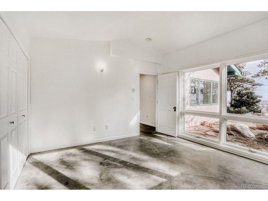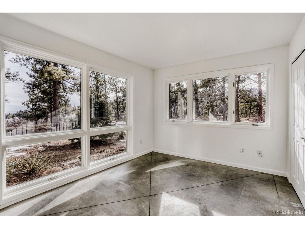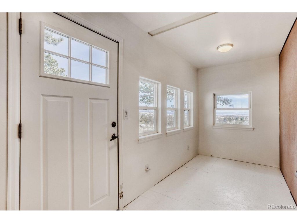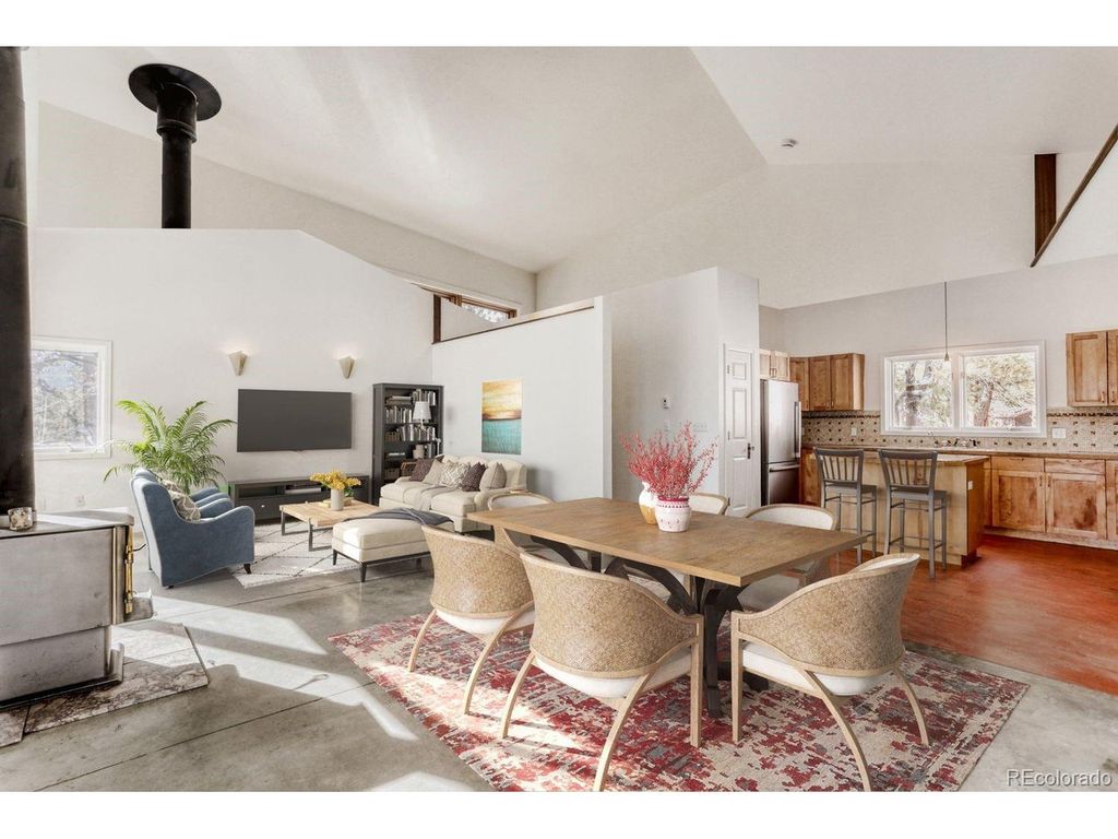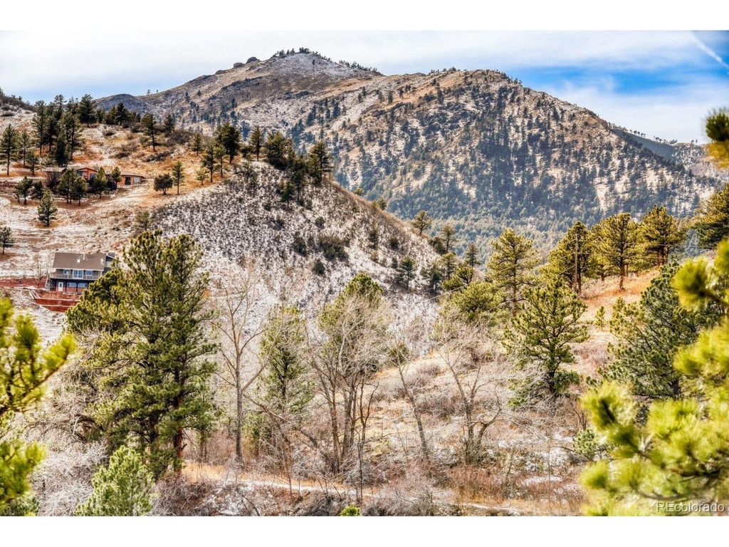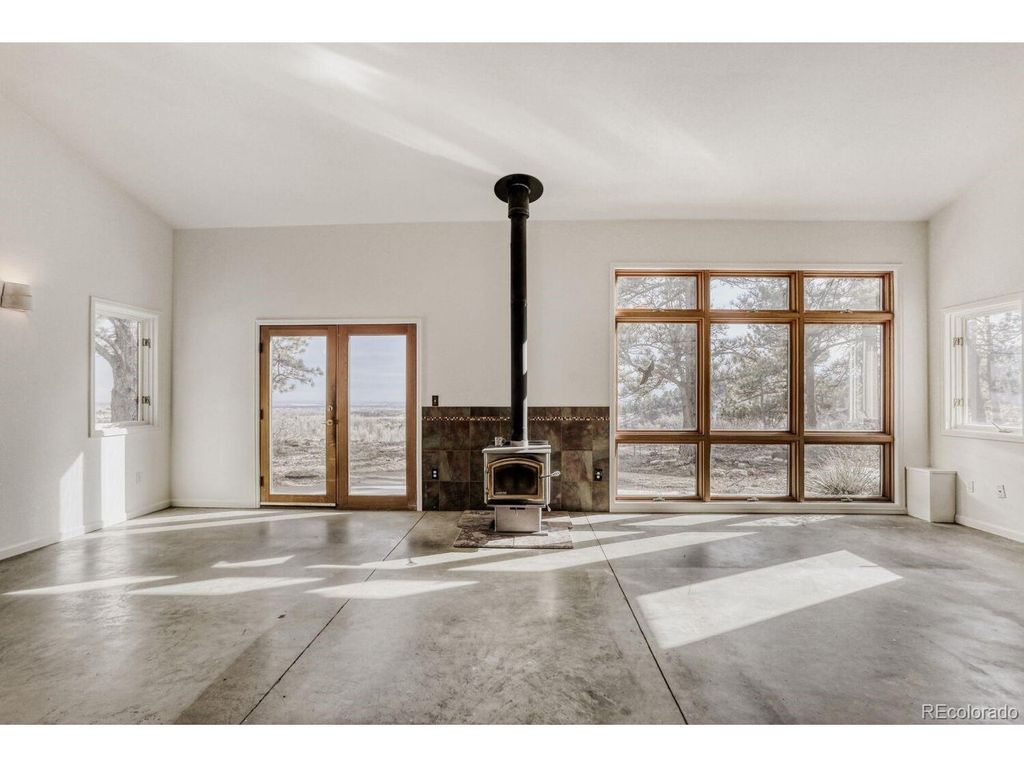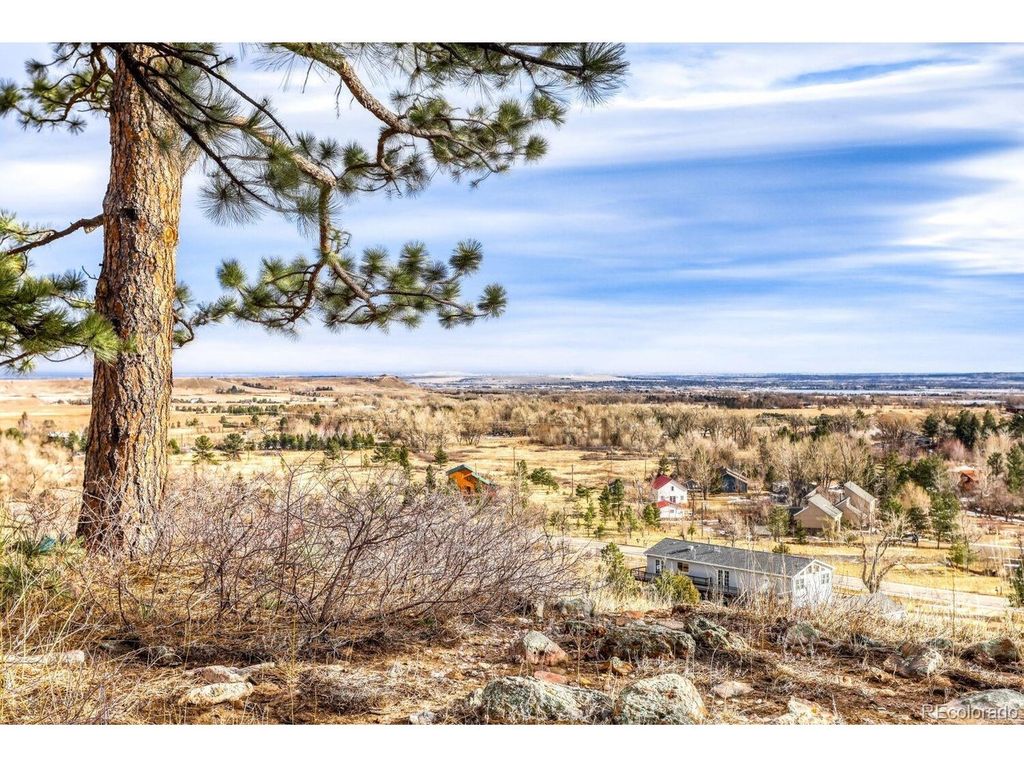 Perched at the top of a private driveway, this rare property offers unobstructed, sweeping views of the Front Range plains, foothills, and iconic Flatirons. South-facing and thoughtfully designed, the home captures abundant natural light and benefits from passive solar warmth, beautifully complemented by modern concrete flooring throughout. An open floor plan with vaulted ceilings enhances the airy feel, while the centrally located wood-burning stove adds cozy warmth and charm to the main living space. Step outside to the south-facing flagstone patio and take in the captivating, ever-changing views-perfect for relaxing or entertaining. Recent updates include a new septic tank, fresh paint, and other improvements, making this home move-in ready. With solid construction and potential to expand, this is a truly special opportunity in an exceptional setting.